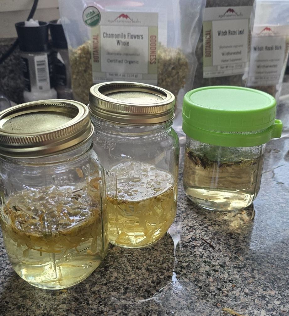 Steep herbs in boiling water for 30–60 minutes. Strain, cool, and use fresh or freeze for later.
